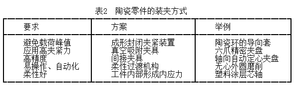 表2 列出陶瓷材料的幾種裝夾方式。陶瓷工件在裝夾過程中要保證工件的夾緊力均勻一致,避免產(chǎn)生應(yīng)力突變點,從而引起因裝夾而產(chǎn)生的工件損傷。特別是對于薄壁類工件,更需要設(shè)計專用的夾具,以保證工件的磨削加工。因為陶瓷工件不導(dǎo)電,不能直接應(yīng)用在電磁吸盤工作臺,需要借助臺鉗夾持工件。對于批量磨削平面零件,就需要設(shè)計專用的夾具,以提高加工效率。